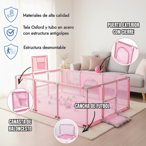Con puerta exterior con cierre, canasta de baloncesto y mini cancha de fútbol, tu bebé juega, aprende y se mantiene activo de forma segura.